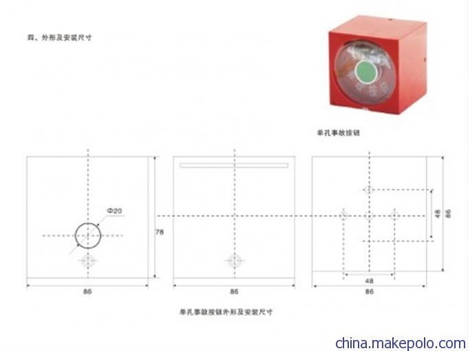2,产品特征防水防尘:内置防水按钮,保护盒使用上下阶梯之间插板防尘和防水密封圈的构造,防水防误操作效用很好,防护等级高大于IP65。安全精确:箱体由耐高压阻燃材质制成。盒体和插入板之间有铅封。它兼具硬存储机能,以保证事故按钮操作的方向性和差错预防。安装和连通螺钉为不锈钢,可保证机柜的高度可靠性。便利的安装:使用分体式安装方法,可选配不锈钢安装板。插板可以拉出。底部下方的盒下方有间距开的防水出口孔(ф1.5),十分便于安装和操作。美观大方:盒主体为鲜红色,总体不突出设计,按钮安装印版上印有荧光油墨的文字徽标。总体构造十分轻盈,美观大方,新颖实用。